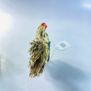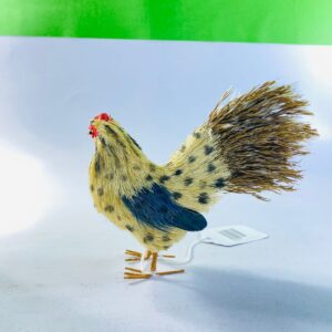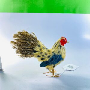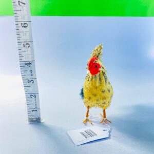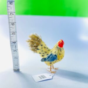 This delightful vintage mini rooster figurine features a handcrafted folk-art style design with vibrant hand-painted details. The rooster showcases a bold red comb, speckled yellow and blue body, and textured feather finish that adds depth and character to the piece.