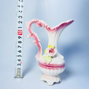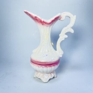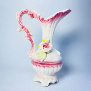 This elegant vintage ceramic pitcher vase features a highly decorative design inspired by classic European ornamental styles. The piece showcases a graceful fluted spout and an ornate sculpted handle with flowing curves, giving it a refined and artistic silhouette.