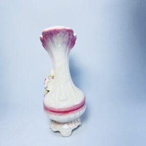 Finished in a soft ivory-white glaze with blended pink accents along the rim and body, the vase is beautifully enhanced with raised hand-painted floral decorations, including delicate roses and leaves in pastel tones. The pedestal base adds stability while enhancing its elegant profile.