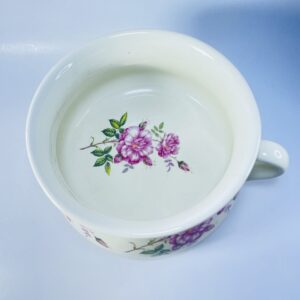 This beautiful vintage handled soup cup is crafted from glazed ceramic and features a classic ivory finish decorated with charming pink floral motifs. The design showcases blooming pink roses with green leaves, delicately applied around the exterior and echoed inside the bowl for an added touch of elegance.