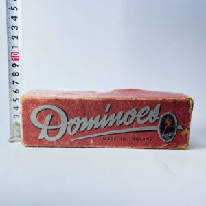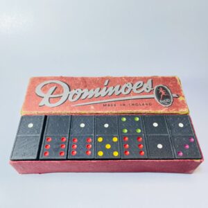 This vintage dominoes set is a classic example of traditional English board games, made in England and presented in its original red cardboard box. The set features black domino tiles with colorful pips, offering a charming retro look that reflects mid-20th century craftsmanship.