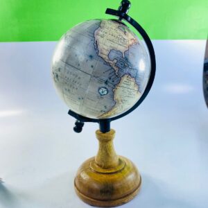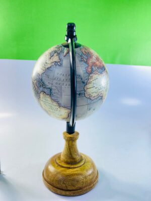 The globe is mounted on a sturdy wooden base with a black metal meridian, allowing smooth rotation. Its compact size makes it ideal for desks, bookshelves, home offices, or study rooms. Whether used as a decorative object or a learning tool, this globe adds character and sophistication to any space.