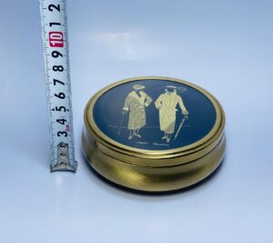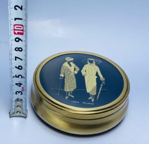 Add a touch of vintage elegance and artistic charm to your space with this beautiful round brass trinket box. The box features a rich black lid adorned with finely detailed gold-tone figures depicting two elegantly dressed women in a classic Art Deco–inspired style, giving the piece a sophisticated and timeless character.