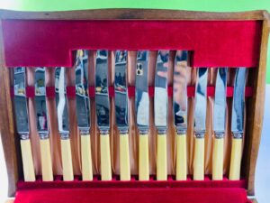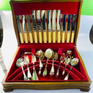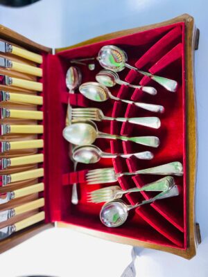 This beautiful vintage cutlery set is housed in a solid wooden presentation box lined with deep red velvet, giving it a timeless and luxurious appearance. The set features polished metal utensils with smooth ivory-colored handles, neatly arranged for both protection and visual appeal.