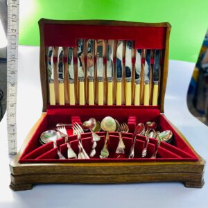 Designed with classic proportions and elegant detailing, this set reflects mid-20th-century craftsmanship and traditional dining style. The velvet-lined compartments keep each piece secure, while the hinged wooden case makes it perfect for display in a cabinet, dining room, or vintage collection.