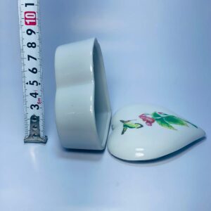 Add a touch of delicacy and natural beauty to your home or belongings with this unique heart-shaped ceramic box. The box features a secure lid and exquisite artistic details, making it a perfect piece for both storage and display. The container is adorned with a charming hand-painted illustration depicting a Hummingbird flying near a flower, symbolizing joy and positive energy. This piece is not just decor; it’s a safe and stylish place to store treasured items and memories.