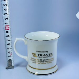 This vintage British commemorative ceramic mug was specially produced to celebrate a 50th anniversary, presented by Travel West Midlands, making it a distinctive piece of corporate and regional British memorabilia.