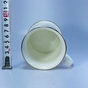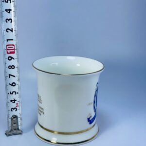 Crafted from glazed ceramic, the mug has a solid cylindrical form with a pedestal-style base and a comfortable handle. Fine gold trim decorates the rim and base, enhancing its classic and ceremonial look. The base bears the maker’s mark, confirming British manufacture and collectible authenticity.
