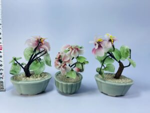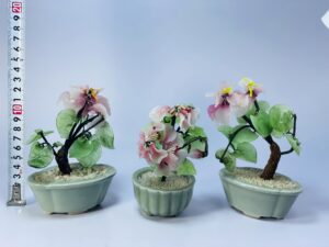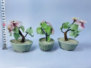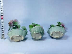 This lovely set of vintage decorative flower arrangements brings a soft, natural charm to any interior. Each piece features delicately crafted artificial flowers with pastel-colored petals and textured green leaves, arranged to resemble miniature flowering trees or plants.
