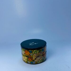 The interior is finished in a dark lacquered tone, adding contrast and depth to the colorful exterior. Its lightweight construction and folk-art aesthetic suggest traditional handcrafted workmanship, making it a charming accent piece for shelves, dressers, or curio displays.
