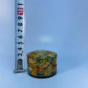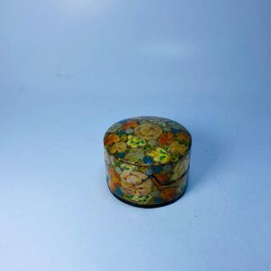 This lovely vintage lidded trinket box showcases a vibrant hand-painted floral mosaic pattern, blending warm tones of yellow, green, blue, and orange in an eye-catching decorative finish. The compact round form is topped with a matching fitted lid, making it ideal for storing small personal items such as rings, coins, or keepsakes.