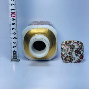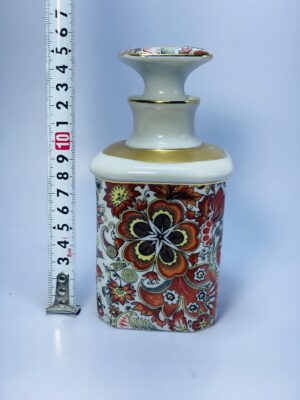 This vintage decorative ceramic bottle is a striking example of traditional ornamental craftsmanship, featuring a richly detailed floral pattern in warm tones of red, orange, green, and cream. The symmetrical design creates a bold visual impact, enhanced by fine gold accents around the neck and base.