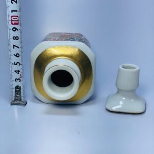 The bottle has a solid, squared body with softly rounded edges and comes with a matching ceramic stopper that completes its elegant silhouette. Crafted from glazed ceramic, the surface has a smooth, glossy finish that highlights the intricate pattern work. The underside bears a maker’s mark, adding authenticity and collectible value.