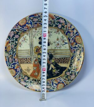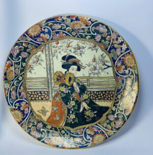 This vintage decorative porcelain plate is a beautifully detailed piece inspired by traditional oriental and Japanese artistic styles. The center of the plate features a finely illustrated scene of a traditionally dressed figure in an elegant setting, surrounded by delicate architectural and floral elements that reflect classic East Asian aesthetics.