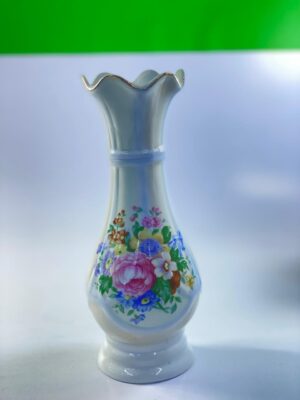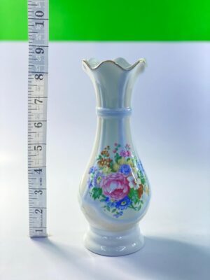 This beautiful vintage porcelain vase showcases classic floral artistry with a delicate hand-painted bouquet of roses and wildflowers in soft pink, blue, and green tones. The vase features a graceful elongated shape with a gently flared, scalloped rim that adds elegance and refinement to its overall design.