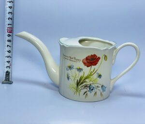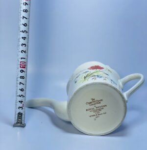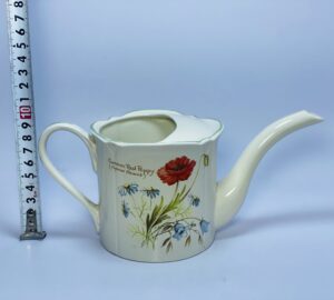 This charming vintage ceramic teapot was produced by the renowned English manufacturer Royal Winton (Grimwades) and showcases a graceful wild flowers design inspired by the English countryside. The soft cream background is beautifully adorned with detailed floral illustrations, including vibrant red poppies and gentle blue blossoms, creating a warm and timeless aesthetic.