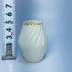 Add a touch of history to your collection with this unique miniature vase produced by the renowned Arcadian China brand. The vase features an elegant semi-oval form with a raised spiral texture covering the surface, complemented by a delicately shaped, gold-accented rim that adds an extra level of refinement.