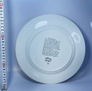 Crafted from glazed porcelain, the plate has a smooth white finish and is intended primarily for decorative display. The reverse side contains a printed historical text and maker’s mark, providing background information and confirming its authenticity and collectible value.