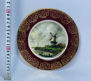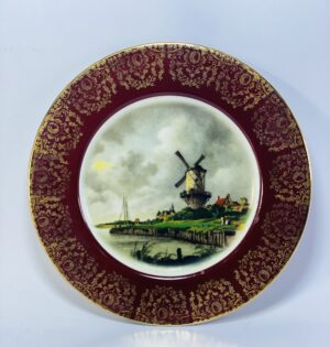 Decoration: Windmill landscape with burgundy and gold rim.