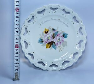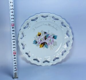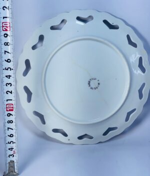 The open lattice-style edge gives the plate a decorative lace-like effect, making it especially attractive when displayed on a wall or in a cabinet. The subtle floral artwork at the center provides a timeless, romantic feel typical of traditional decorative porcelain.