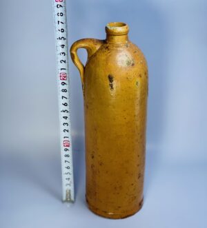 Originally intended for storage of liquids such as beer, cider, wine, or spirits, this type of bottle was commonly used in the 19th to early 20th century. The narrow neck and thick walls highlight its functional design, while the earthy glaze gives it a warm, rustic appearance.