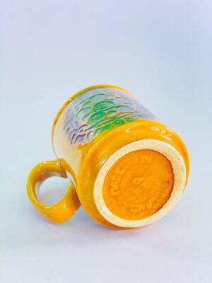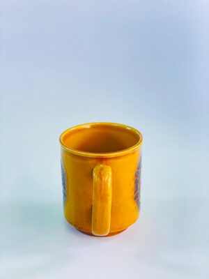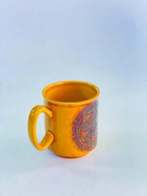 This charming vintage ceramic mug showcases a bold embossed floral medallion design, highlighted by a warm amber-yellow glaze with subtle tonal variations. The textured relief decoration gives the mug a handcrafted studio pottery feel, making it both visually appealing and pleasant to hold.