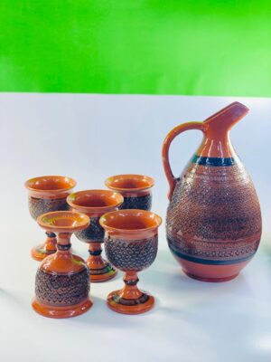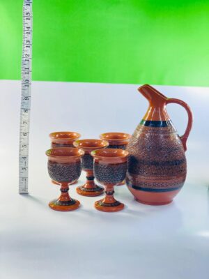 The jug features a generous curved handle and pouring spout, while the goblets stand on short pedestal bases, giving the set a cohesive and elegant appearance. The rich brown and terracotta tones, combined with the textured surface, add depth and character to each piece.