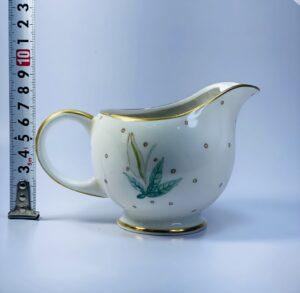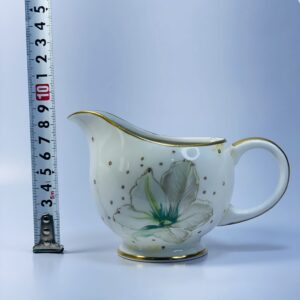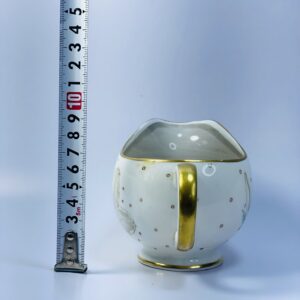 This elegant vintage porcelain cream jug showcases a refined balance of classic form and delicate decoration. Crafted from fine glazed porcelain, the jug features a gently rounded body, a graceful pouring spout, and a comfortable handle accented with gold detailing for an added touch of sophistication.
