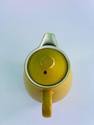 This stylish vintage ceramic teapot features a beautiful mustard yellow glaze with a clean, minimalist silhouette inspired by mid-century modern design. Its softly rounded body, curved spout, and matching lid create a timeless and well-balanced form.