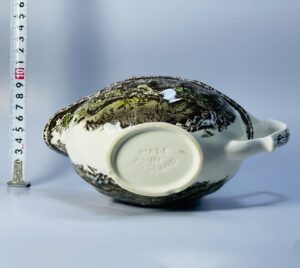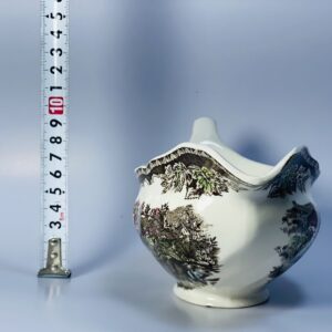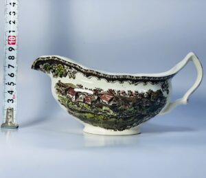 This beautiful vintage porcelain gravy boat showcases traditional English transferware craftsmanship with a richly detailed scenic village design. The piece features a panoramic countryside scene with houses, trees, and rolling landscapes, rendered in earthy tones that give it strong character and historical charm.