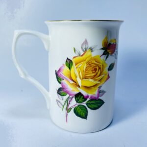 Crafted from fine bone china, the mug features a stunning hand-applied yellow rose with delicate green leaves, complemented by subtle pink accents. On the reverse, the mug is adorned with gold script reading “Golden 50th Anniversary”, making it a meaningful commemorative keepsake.