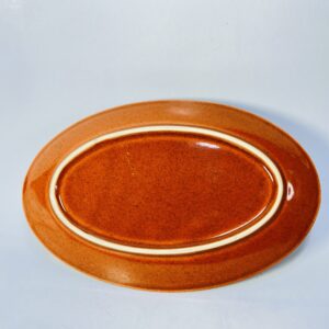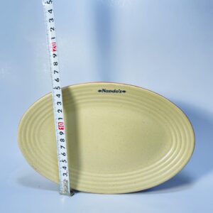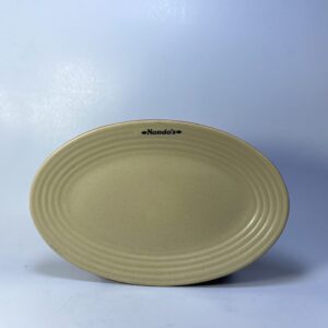 This original Nando’s oval serving plate is a genuine piece of restaurant ware, designed for durability and everyday use. Crafted from sturdy stoneware, the plate features a warm beige glaze with a subtle speckled finish, complemented by a ribbed border that adds texture and character.