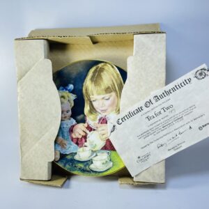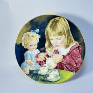 “Tea for Two”, part of the beloved Memories of Childhood series. The artwork depicts a young girl carefully pouring tea for herself and her doll, evoking innocence, warmth, and nostalgia.