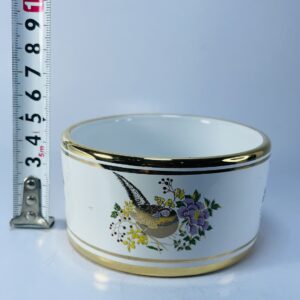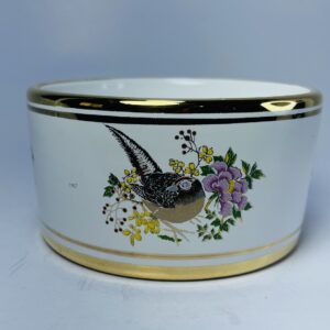 This charming vintage ceramic bowl is a handcrafted piece from Greece, marked “Nofitou – Hand Made in Greece.” It showcases a delightful nature-inspired design, featuring a finely detailed bird surrounded by colorful flowers, bringing a classic Mediterranean aesthetic to the piece.