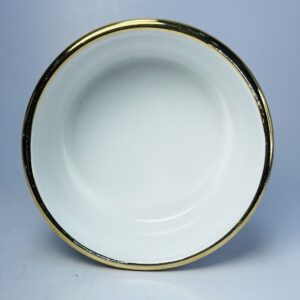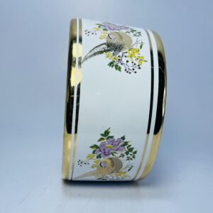 The bowl is finished with gold rim detailing along the top and base, adding a refined decorative touch. Its clean white glaze provides a perfect backdrop for the vibrant artwork, while the smooth interior makes it suitable for light functional use.